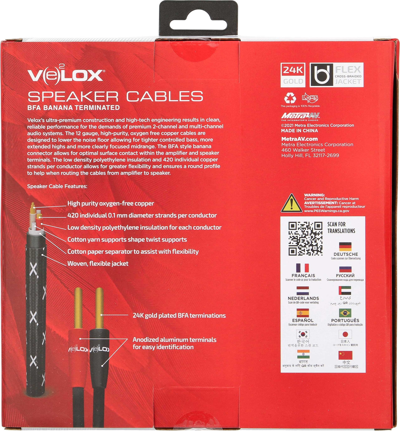 Audiophiles can plug into a better AV experience with HiFi cables that sound as good as they look. Velox once again proves that what’s on the inside is just as important as its great aesthetics on the outside. Using only the finest materials and construction, these 12 gauge cables deliver the purest undegraded sound possible to your speakers. They feature high purity oxygen-free copper with hundreds of tightly woven solid-core conductors for excellent conductivity. To allow better flexibility, cotton paper separates the PVC jacket and conductors and cotton yarn supports the twist shape design. The low-density polyethylene insulation for each conductor avoids adding bulk, allowing the woven, flexible outer jacket to protect the cable from wear and tear without making it too stiff for installation. The BFA terminations allow a greater surface area between the cable and the terminal and are 24K gold plated with anodized aluminum terminals.