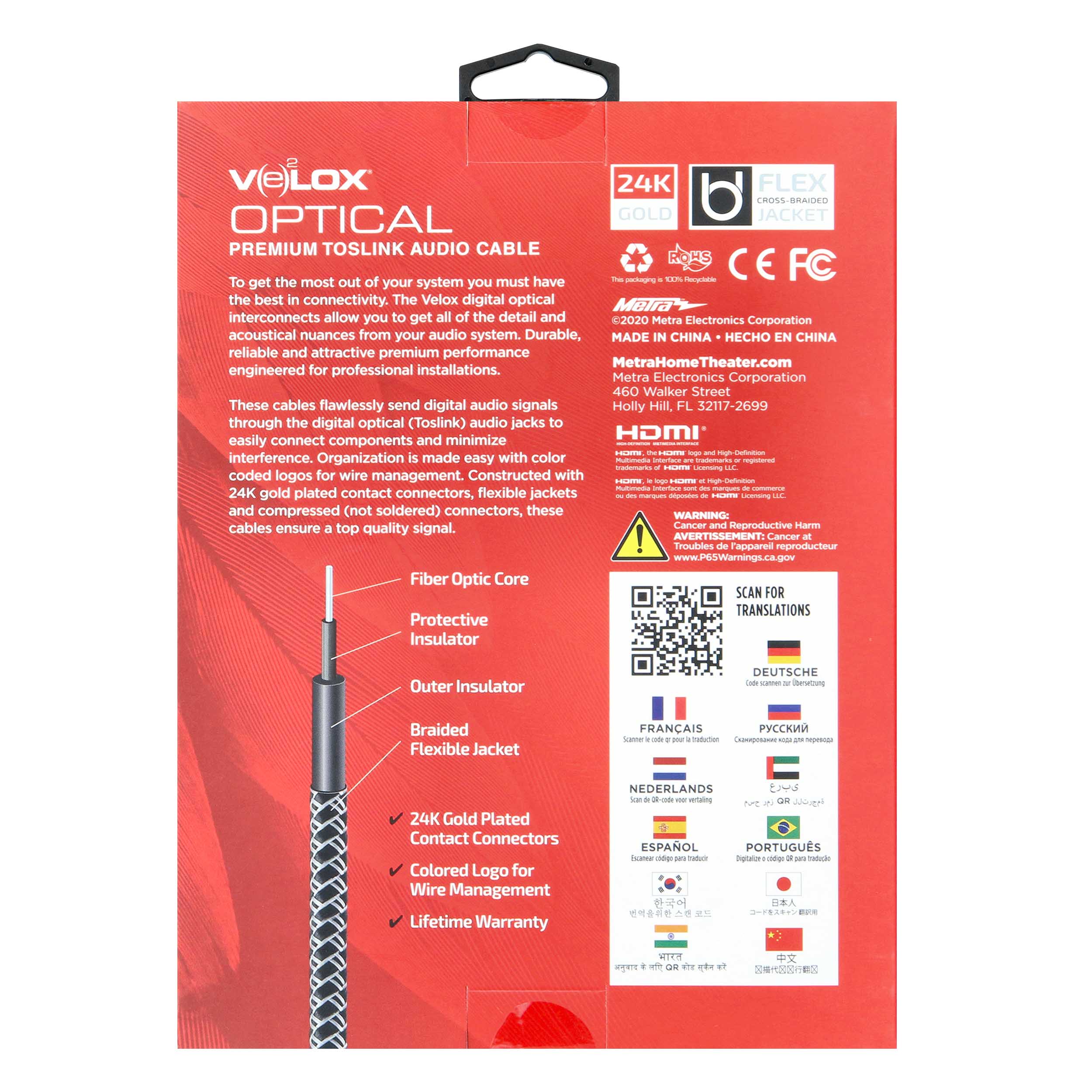 The Velox Optical Audio Cables are the premium cables needed for digital systems (2channel audio). These cables flawlessly send digital audio signals through the digital optical audio jacks to easily connect components and minimize interference. Constructed with 24K gold plated contact connectors and cotton flexible jackets, these cables ensure a top quality signal to your audio system. Organization is made easy with the colored logo for wire management. LIFETIME WARRANTY.
