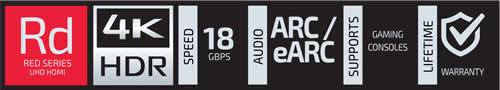 Flexibility and small terminal size are just the first benefits offered by the Red Series HDMI® cables. To make your system hookup and cable identification easy, every Red Series cable comes with (2) sets of colored jewel inserts (4 colors) for each terminal, the low profile cable diameter also adds to the ease of setup. The Red Series of HDMI®cables fully support all HDMI® 2.0 devices, HDR, Dolby™ Vision, Dolby™ Atmos and HDCP 2.3.