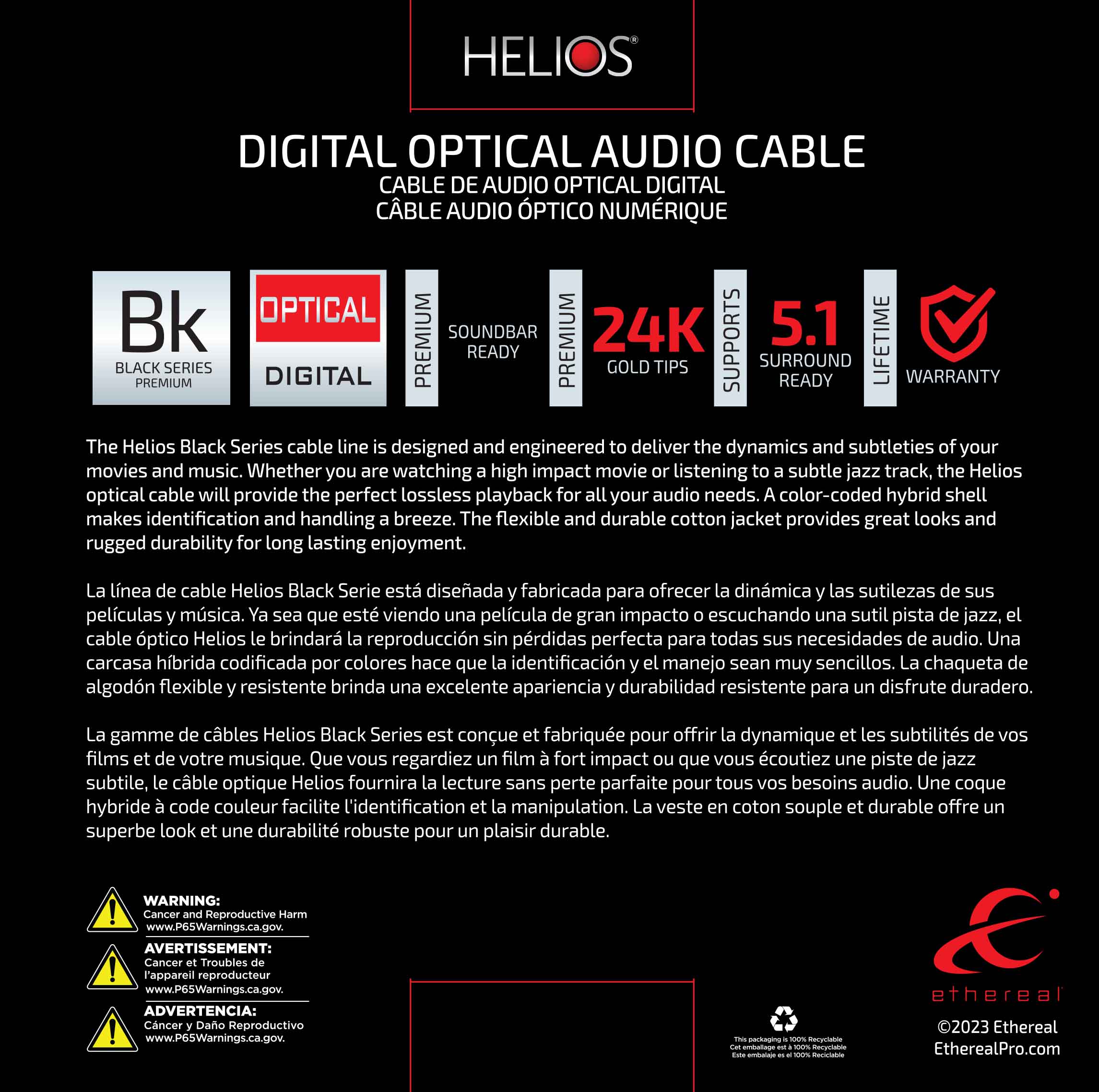 Providing a simple one cable connection, this Helios optical cable is a great way to get the best possible sound through an optical digital audio cable. Color-coded, easy-grip terminals simplify hook up.